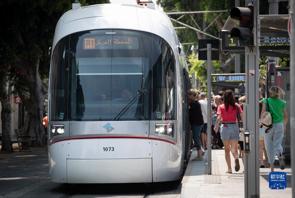 2023年8月18日,在以色列城市特拉维夫,人们在轻轨红线布卢姆菲尔德体育场站上下车。特拉维夫轻轨项目是以色列建国以来最大的政府特许基础设施建设项目,分为红线、绿线、紫线等线路,其中进展最快的红线全长约24公里,连接起特拉维夫及其下辖的几座卫星城市,沿途共设34个车站,其中24个为地面车站,10个为地下车站。