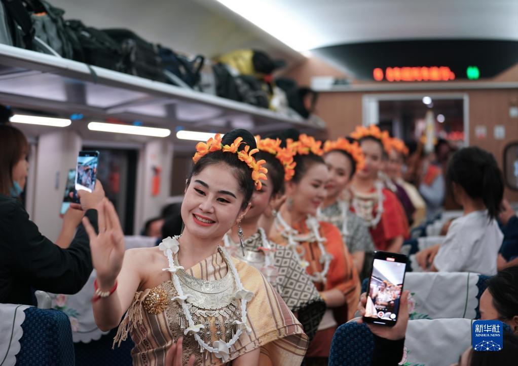 2023年4月13日,老挝工作人员在D887次国际旅客列车上表演。北起中国昆明,南至老挝万象,全长1035公里的中老铁路跨越山河,促进了中老两国以及共建“一带一路”国家间的经贸合作和文化交流,成为联通内外、辐射周边、双向互济的黄金大通道。