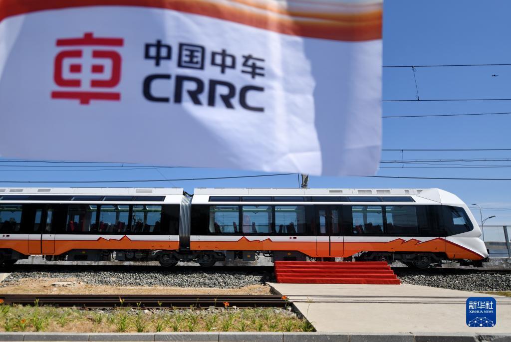 这是2023年6月6日在中车唐山公司内拍摄的中国中车出口阿根廷新能源轻轨车。当日,中国中车出口阿根廷新能源轻轨车辆首列车在中车唐山公司下线,这也是我国新能源轻轨车辆首个出口项目。这款新能源轻轨车,具有可拓展多种动力模式、灵活可变编组等功能,将服务于阿根廷胡胡伊省。