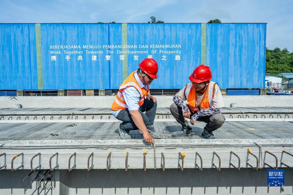 2023年4月26日,在马来西亚吉兰丹州的马东铁项目一分部制梁场,技术主管邓友志(右)和马来西亚本地青年员工邓德纬讨论生产情况。共建“一带一路”倡议框架下的马东铁项目对促进当地经济发展、基础设施建设与联通、增进民生福祉有着重要作用。