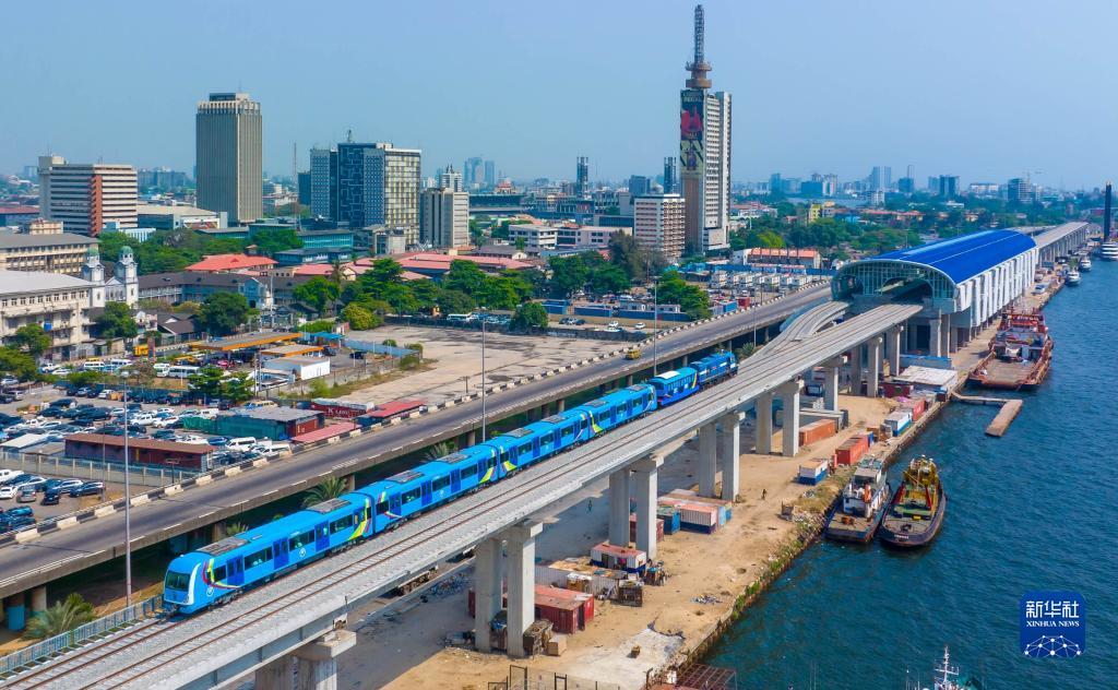 这是2022年12月21日在尼日利亚拉各斯拍摄的轻轨蓝线上的一列轻轨列车(无人机照片)。由中国土木工程集团有限公司承建的拉各斯轻轨蓝线项目一期是西非第一条由中国企业自主设计、建造、施工、运营的电气化城市轻轨交通项目。
