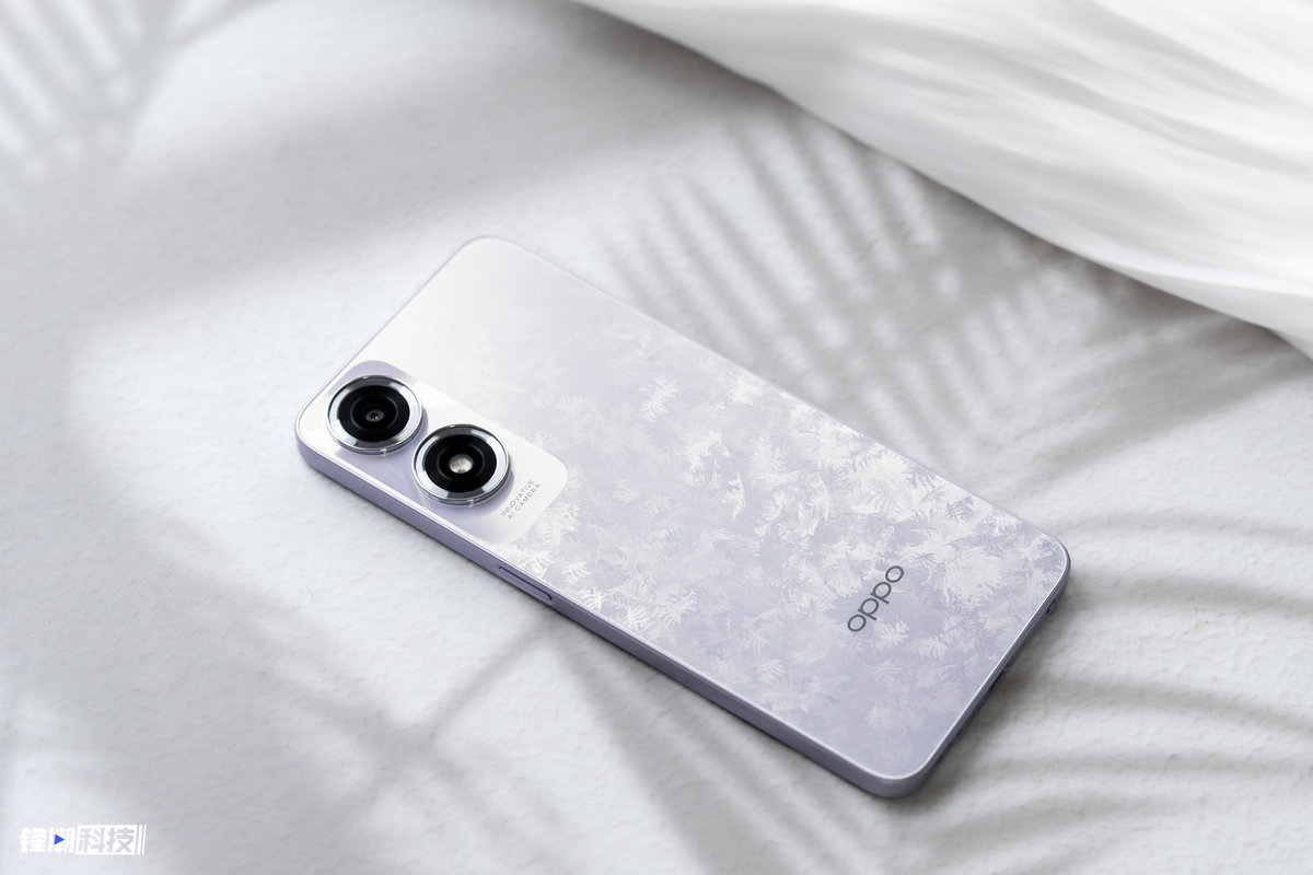 我们这一次收到的是飞霜紫配色的 OPPO A2x,它的基底是比较浅的渐变紫色,在基础的底色之上,还运用了微纳 3D 光刻技术和多维光场调制,超薄的膜片上呈现了细密重叠的冰花纹理,为手机后盖增添了几分闪耀的层次感。如果你喜欢的是沐光金的配色,能看到的则是类似此前 Reno 系列中运用的金色流纱纹理,看起来一样精致好看。