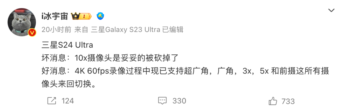 对于三星Galaxy S24 Ultra,这位博主表示已经没有了上一代 S23U 上的 10x 光学镜头,替换的是一颗 5x 的长焦镜头,但好处是在 4K 60fps 的录像可以支持超广角、广角、3x、5x 以及前置镜头的来回切换。