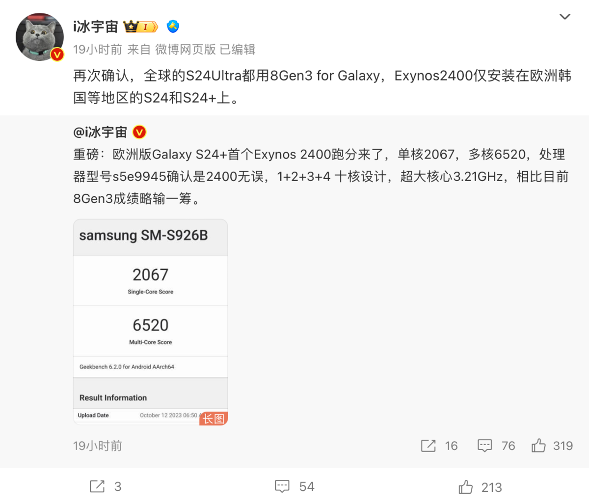 10 月 13 日信息,微博数码博主@i冰宇宙 表示,三星 Galaxy S24 Ultra 将全球搭载骁龙8 Gen3 for Galaxy 处理器,而三星Exynos 2400 芯片仅在欧洲和韩国等地区的 S24 和 S24+ 搭载。