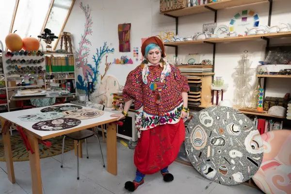 贝森·劳拉·伍德(Bethan Laura Wood)是国际知名的英国珠宝、家具、装饰、照明和装置设计师。色彩丰富的妆容、独特的服饰搭配是 Bethan Laura Wood 的符号。强烈的色彩、大胆的形状、巧妙的材质混搭是她设计风格的标志。她被称为“英国最具辨识度设计师”、“彩色精灵”。于她而言,激发创作灵感的往往不是单一的物件或材料,而是在材料的寻找并与工匠的合作过程中。她用独特的视觉隐喻和镶嵌术,将日常物品重新语境化,以图案和色彩述说它们的起源、工艺和过去的用途。她的作品被全世界众多知名美术馆珍藏。