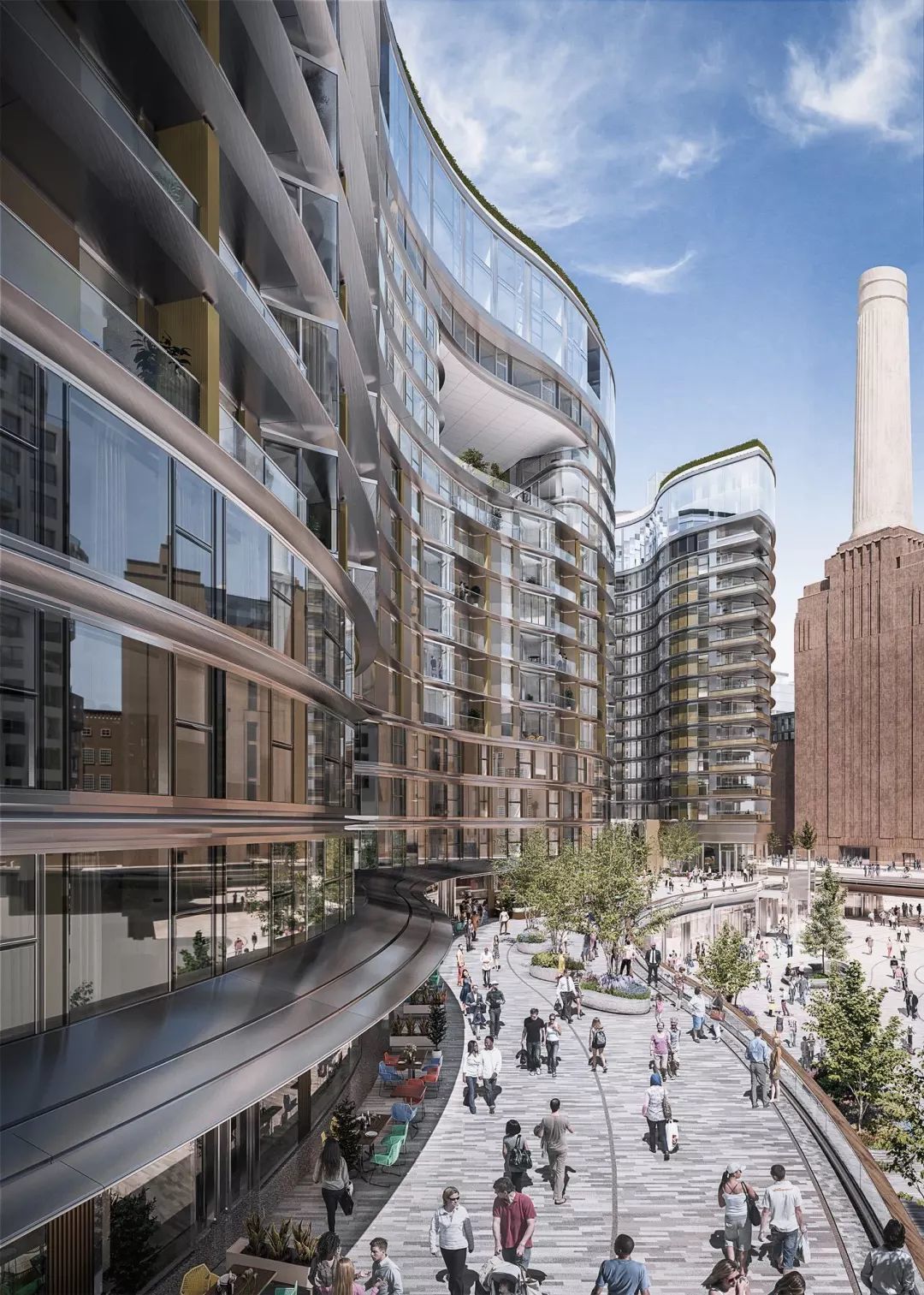 Battersea Roof Gardens 毗邻巴特西发电站,由著名设计事务所 Foster+Partners 打造,项目以其独特的波浪般蜿蜒造型引人注目,两端分别容纳医疗中心和酒店,而中间则是公寓楼。建筑的带状外观采用了白色混凝土、金属和大量玻璃,呈现出优雅轻盈的外观。同时,建筑中空出的一些部分被设计成花园,丰富了整体环境。