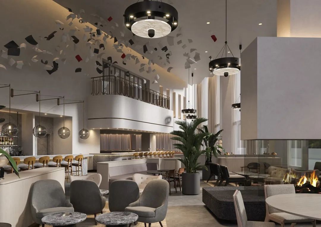 Stratford 酒店位于伦敦东部的伊丽莎白女王奥林匹克公园的文化中心,这座壮观的双悬臂式 42 层建筑由 SOM 设计,而室内由丹麦设计工作室 Space Copenhagen 操刀,其中包括了家具定制和配套设置等。