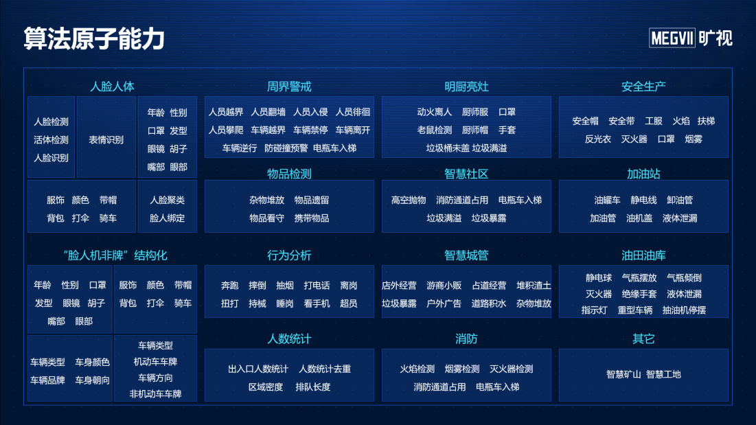 其中,旷视AI赋能中台的算法原子能力可为用户提供如明厨亮灶、行为警戒、智慧城管等十余个场景下的百余种商用级算法;旷视自研的AIS一站式算法训练平台可支持运营商客户结合自身的算力网络和旷视自研行业大模型,高效地定制开发全新的算法模型,以解决碎片场景中的无限新问题。