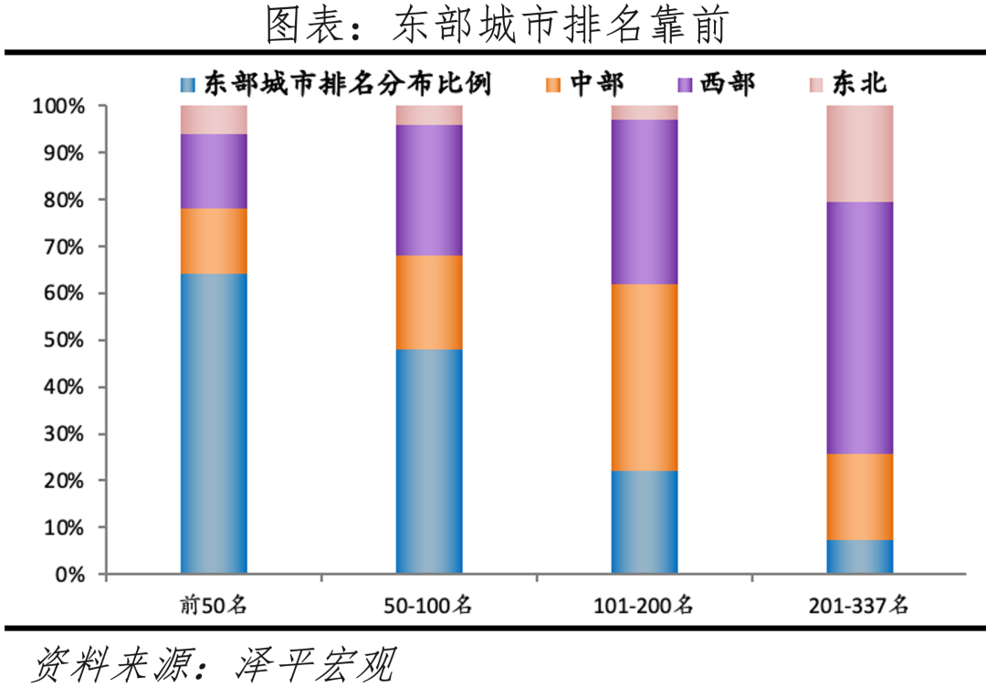 1)分地区看,发展潜力TOP50城中南方城市占据36城,力压北方;东部地区城市占据32席,领先于其他三大地区;而东北地区仅3城位于TOP50,78%城市为200名之后,经济不景气制约其房地产市场发展。分南北看,榜单前50名、51-100名中,南方上榜城市数量分别为36、26个,占比分别为72%、52%,南方城市排名靠前的占比明显大于北方。分四大区域看,榜单前50名中,东部、中部、西部、东北地区城市数量分别为32、7、8、3个,占比分别为64%、14%、16%、6%,中西部潜力城市主要集中在成都、武汉、重庆、合肥、西安、长沙、郑州等区域中心城市,东北地区仅核心城市沈大长跻身前50名。