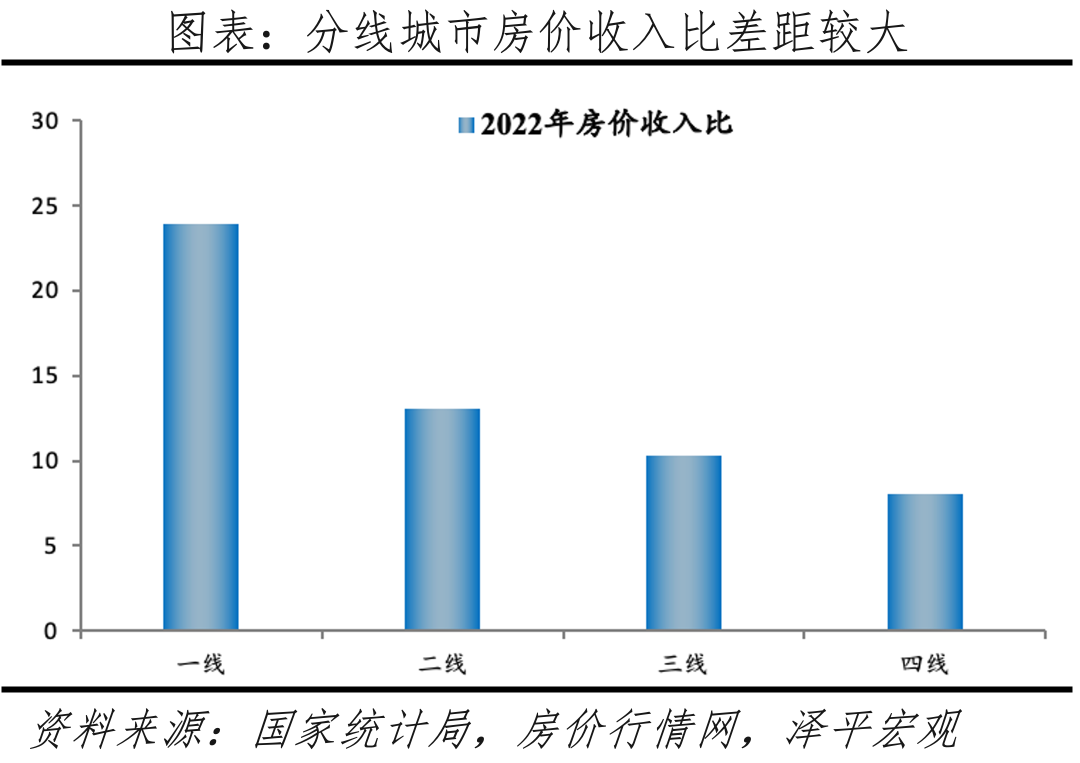 房价收入比方面,2022年,一线、二线、三线、四线城市房价收入比分别为24.0、13.0、10.3、8.1,城市间分化显著,这与全球其他经济体核心城市房价收入比较高的情况一致。具体看,全国房价收入比前十的城市分别为三亚、北京、上海、杭州、深圳、宁德、厦门、福州、丽水、莆田,均位于东部地区,其中三亚为全国旅游城市、房价主要受外来者购房推动。从原则上讲,在供需基本平衡的市场,房价由中位数收入人群决定;在供给明显大于需求的市场,房价由低收入人群决定;在供给明显小于需求的市场,房价则由高收入人群决定。并且,与国外明显不同,因文化传统差异,中国父母对子女的资金支持通常较大,这使得传统房价收入比的度量存在一定偏差。不过,考虑到现实并无更好的指标及数据衡量相对购买能力,本文依然采用房价收入比度量。