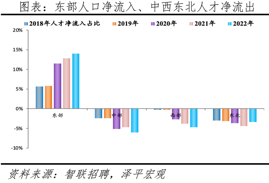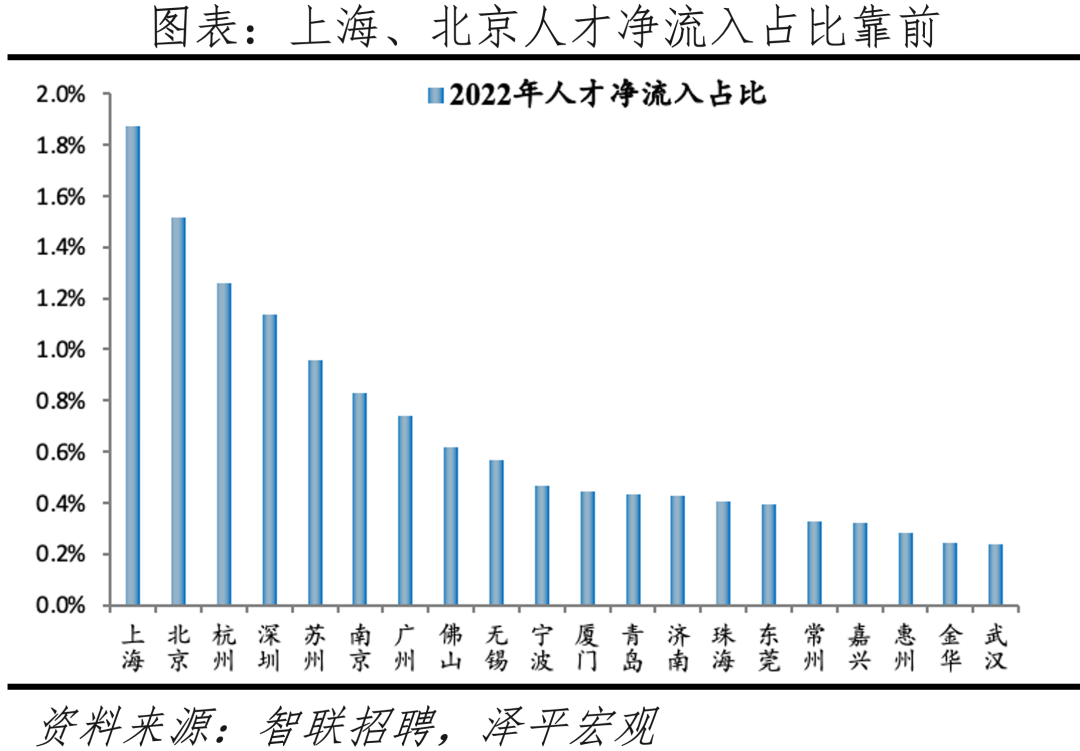 人口是一切经济社会活动的基础、人才更是第一资源。根据我们与智联招聘联合推出的《中国城市人才吸引力排名2023》,近年人才仍不断向东部城市集聚,长三角、珠三角城市群人才集聚能力逐渐增加。分区域看,2018-2022年东部地区人才净流入占比从5.7%增至14.1%,得益于雄厚的经济基础和较高的战略定位,人才持续向东部集聚;中部、西部地区人才持续净流出,且净流出占比加大。分城市群看,超6成人才流向五大城市群,长三角、珠三角人才持续集聚,2018-2022年人才净流入占比分别从4.6%、2.2%增至7.9%、3.9%;京津冀人才净流出趋势继续放缓,成渝、长江中游城市群人才净流出。随着人口红利消逝、人才价值日益凸显,如何吸引人才、留住人才并培养人才成为各城市提升综合实力的手段。2017年初以来,各地掀起“抢人大战”,城市人才竞争不断升级,2022年以来各地人才政策不断优化,包括放宽人才落户政策、提供租购房补贴、创业补贴等,逐渐从“抢人”向“抢人才”转变。
