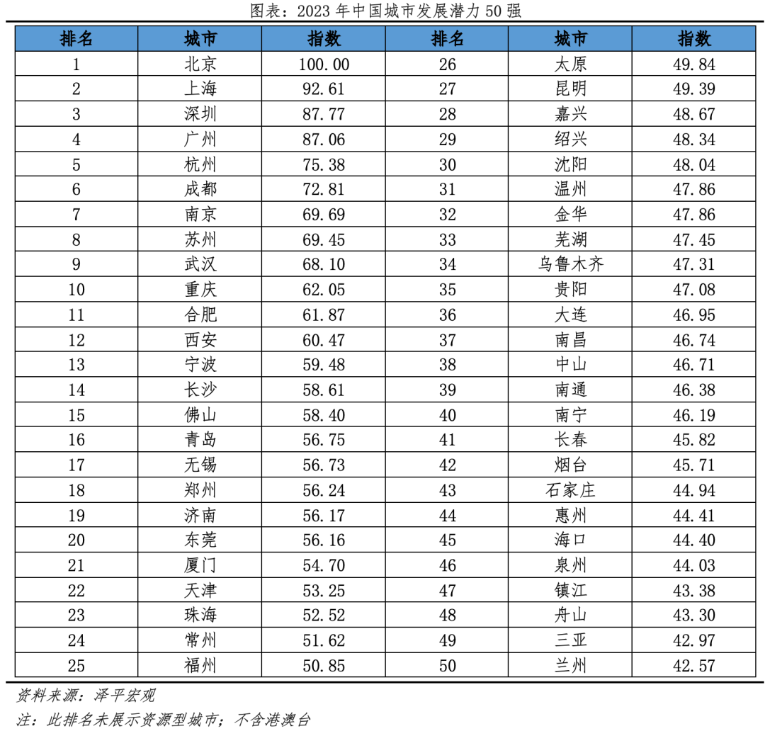 2)分线看,一二线城市排名遥遥领先,核心城市群内部三四线城市排名靠前。发展潜力TOP50城中一二三四线城市数量分别为4、32、13、1个,分别占各线城市总量的100%、91.4%、16%、0.5%。从一线城市看,北上深广位列排名前4;从二线城市看,TOP50中占据32城,占榜单64%,占二线城市总量的91.4%,所有二线城市均进入百强榜。从三四线城市看,进入前50名的三四线城市共有14个,大都位于大城市群、靠近城市群中心城市。
