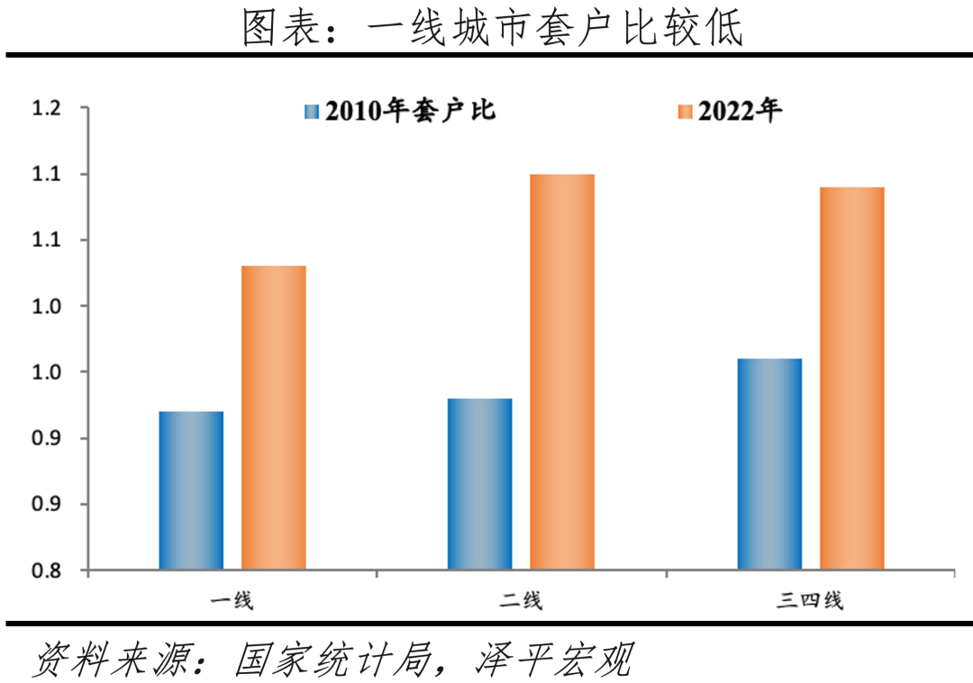 当前一线住房供给偏紧,2022年套户比为1.03,中部和东北地区相对过剩,2022年套户比分别为1.10、1.27。我们在《中国住房存量报告2023》估算了2022年各省级、地级单位城镇住宅套户比。分线看,2022年一线、二线、三四线城镇人均住房建筑面积分别为29.2、36.1、37.8平米;套户比分别为1.03、1.10、1.09。分地区看,2022年东部、中部、西部、东北地区城镇人均住房建筑面积分别为33.9、39.7、34.4、37.0平;套户比分别为0.99、1.10、1.05、1.27。在全国336个地级及以上单位(不含三沙)中,2022年有33个城市的套户比小于0.9,占比9.8%;有49个城市套户比介于0.9-1.0,占比14.6%;有86个城市的套户比介于1.0-1.1之间,占比36%;有95个城市的套户比介于1.1-1.2之间,占比28.3%;有73个城市的套户比高于1.2,占比21.7%。分城市看,一二线城市中2022年套户比小于1的城市分别为合肥、广州、佛山、东莞、深圳、杭州、宁波、南京,住房供应相对不足。