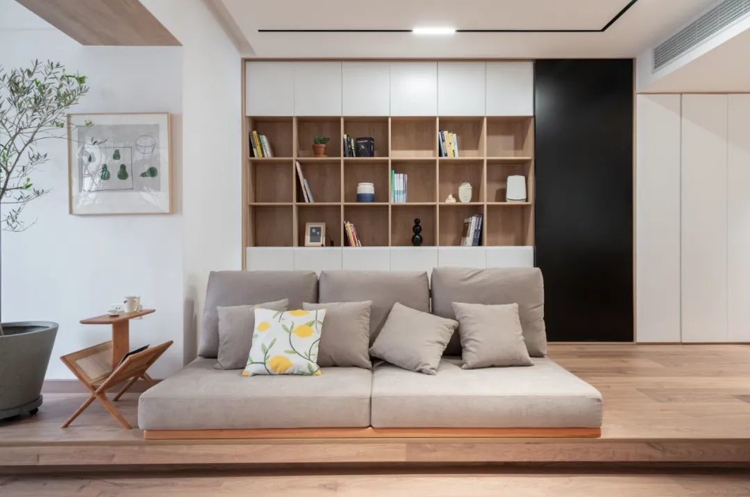 将沙发往前移一下,留出柜子的空间,不管是作为书架藏书使用,还是作为展示柜使用,都非常合适。