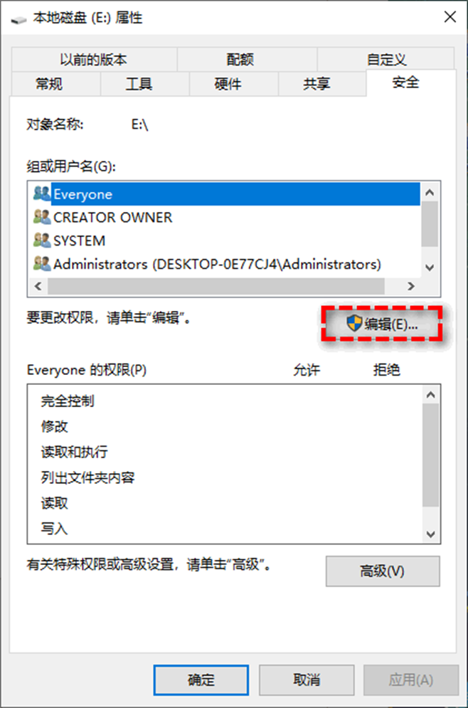 2. 接着点击“安全”标签,然后按下“编辑”按钮,并选择当前用户。