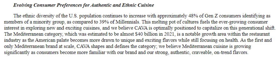 从Cava这家公司的发展过程也可以看到,它是第一家也是唯一一个规模化发展的地中海餐饮品牌,有了这个强大的定位,资本市场就会给它很大的期待和很高的估值。