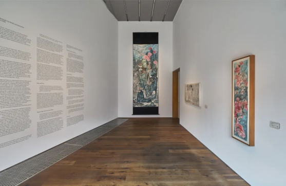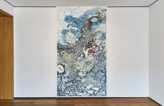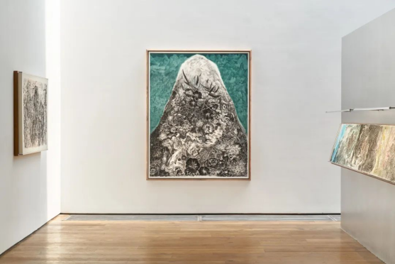 彭康隆的中国画传统学养师从国画大家何怀硕。由北宋山水巨幅构图形式的感豁,融合石涛、髡残、黄宾虹传统山水一脉相承的滋养。他的水墨绘画以笔为骨,墨为肉,并不拘泥于传统图式的窠臼,画面笔墨密集、张扬,元气淋漓。常以巨大花卉草木置于要紧处,又以刻画精微的山石,在峰回路转间形成超越现实场景,而向内关照的内省。近期的“集大成,得卓然”个展中两幅长手卷《括囊无咎》、《含章可贞》,巨幅立轴《隆崇赋》,以及两幅横构图巨幅画卷《山花浪漫时》、《白露烁烁》,最能彰显其生命状态的佳作。