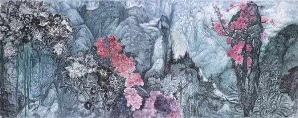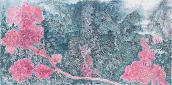 《山花浪漫时》, 2023, 纸本水墨设色, 146 x 367 cm