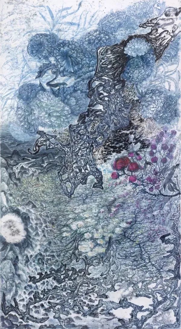 近作《括囊无咎》、《含章可贞》中花朵、山石筋脉以荷叶皴、解索皴随行笔间的情绪相互融合;或以侧锋用笔,墨色多变化,线与面共同呈现,在信马由缰,逸笔草草间,完成黑、白、浓、淡、干、湿在山石、花木上的气韵转合。亦如新作《逍遥游》近景自下而上婉转的溪水、山石,《隆崇赋》远山的水汽氤氲、湿润华滋。
