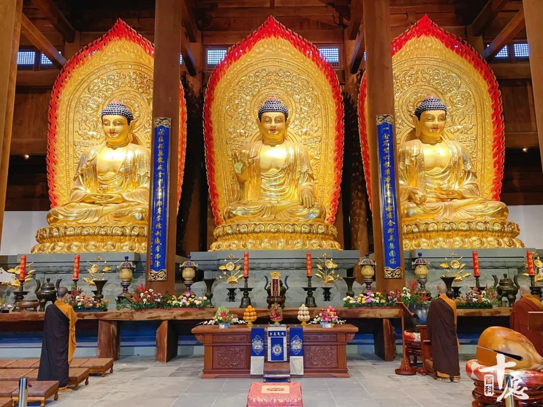 有些寺院会在主殿供奉三尊佛菩萨圣像,以文殊菩萨、普贤菩萨为娑婆世界教主释迦牟尼佛的左右胁侍,三者合称为“华严三圣”。
