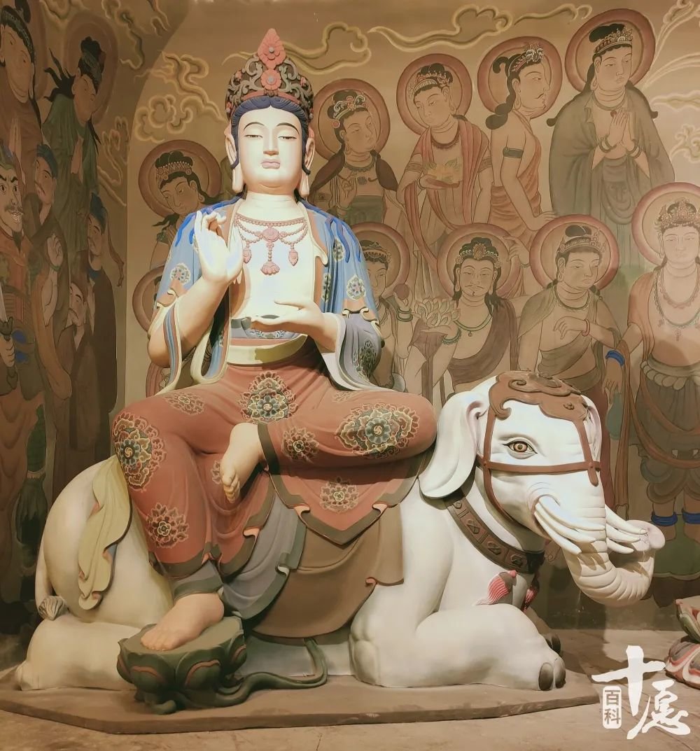 主要特点:头戴五佛冠,身骑六牙白象,手执青莲,或持法杵或如意。