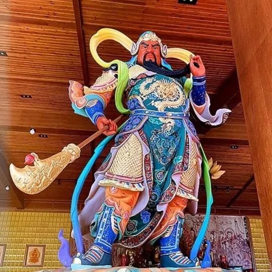 主要特点:各寺院常用关公形象作为伽蓝菩萨的代表,一般是身穿深绿袍,胸前有一盔甲,手拿青龙偃月刀,五官及表情刻画均以怒目英勇为主。