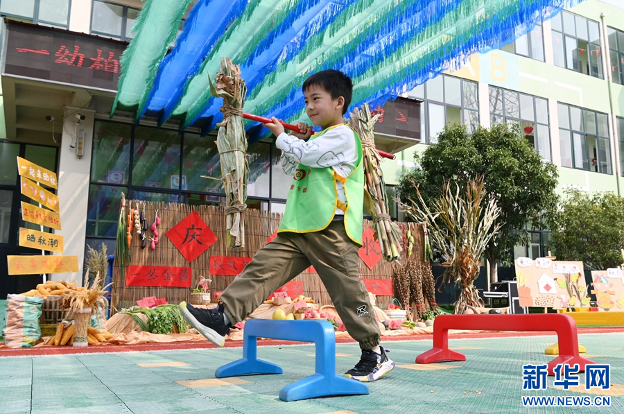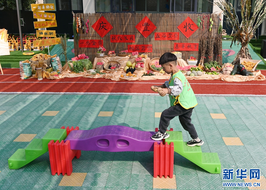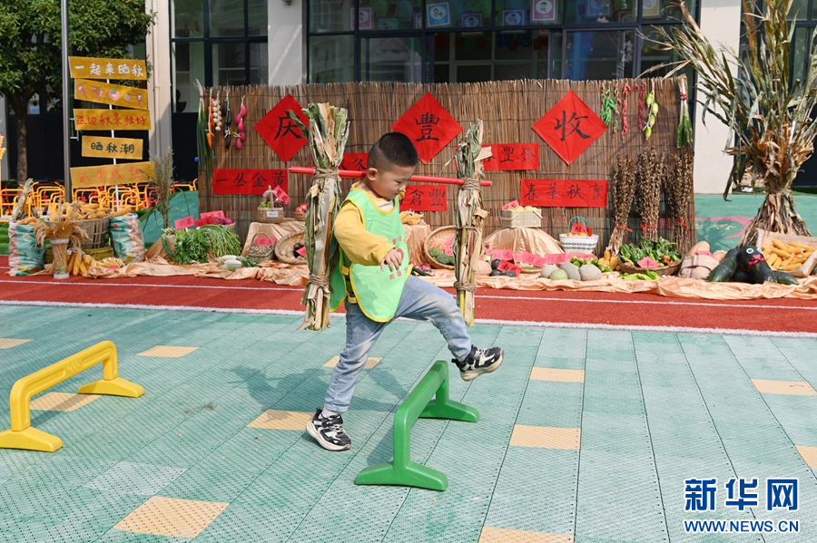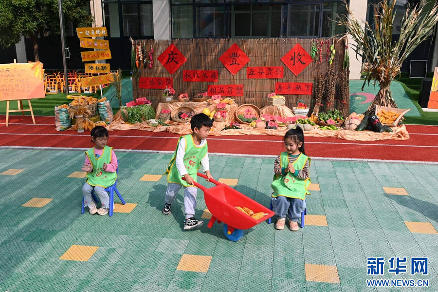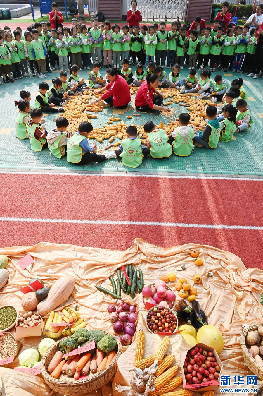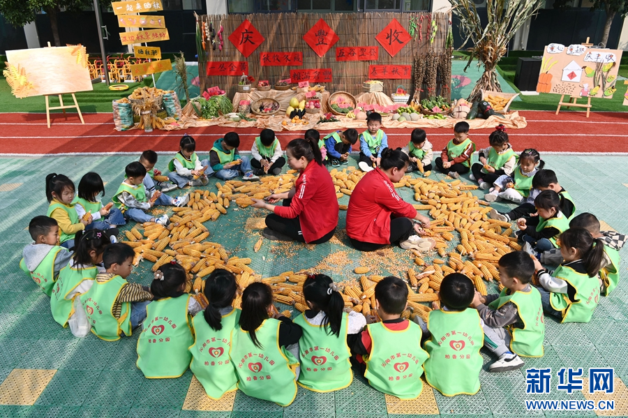 10月13日,河南省沁阳市第一幼儿园柏香分园开展金秋“庆丰收”活动,通过“运玉米”、“挑担子”、“土豆闯关”趣味游戏,以及扯玉米穗皮、剥玉米粒劳动,让小朋友从中懂得农耕劳作的艰辛和不易,体验劳动带来的收获和喜悦。新华网发(杨帆 摄)