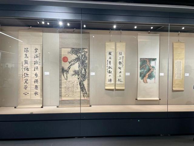 特别是其诗作,才思敏捷,文思泉涌,相传他曾在上海至哈尔滨的火车上写了五十首咏史绝句,并被传为美谈。展厅中陈列了苏渊雷先生各个时期的诗作稿本,其大幅书法作品内容多数也为个人所撰,作为传统文人,他偶尔为之的梅兰竹菊与松石也格外的意趣横生,体现了文人的雅趣,展厅中的梅兰竹菊小四条屏用笔劲道笔墨酣畅。其1977年所绘作品《红旭青松图》,是其生平最重要的代表作之一。