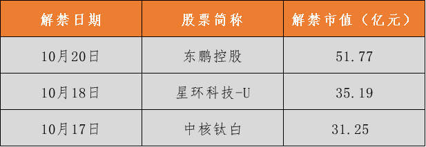 具体来看,东鹏控股10月20日将解禁5.3亿股,为首发原股东限售股份;星环科技-U 10月18日将解禁0.55亿股,为首发原股东限售股份及首发战略配售股份;中核钛白10月17日将解禁6.71亿股,为定向增发机构配售股份。