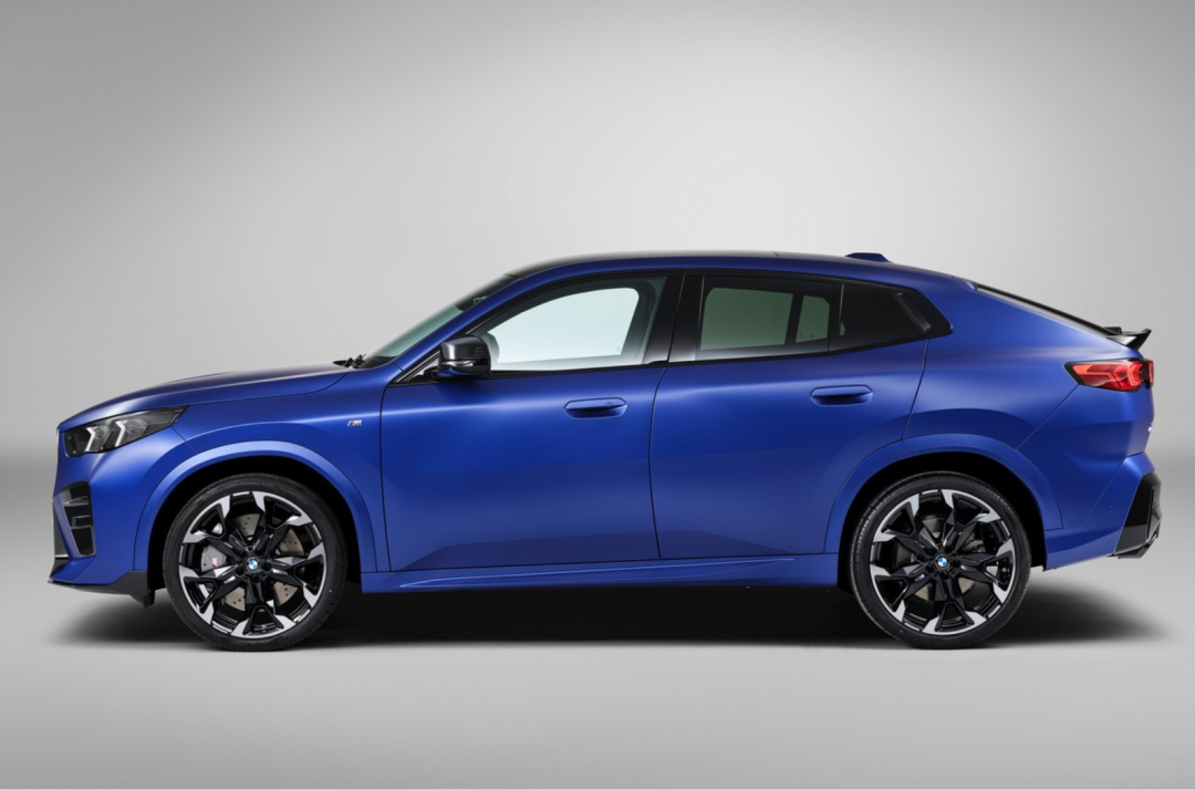 车身侧面,宝马X2/iX2都以更接近轿跑风格设计体现,并采用了隐藏式门把手,与宝马X4/X6不同的是,宝马X2/iX2有着更硬朗的感觉,少了宝马X4/X6流线型设计,虽然都拥有溜背式造型,但风格更贴近宝马XM,也像多了“屁股”的XM。