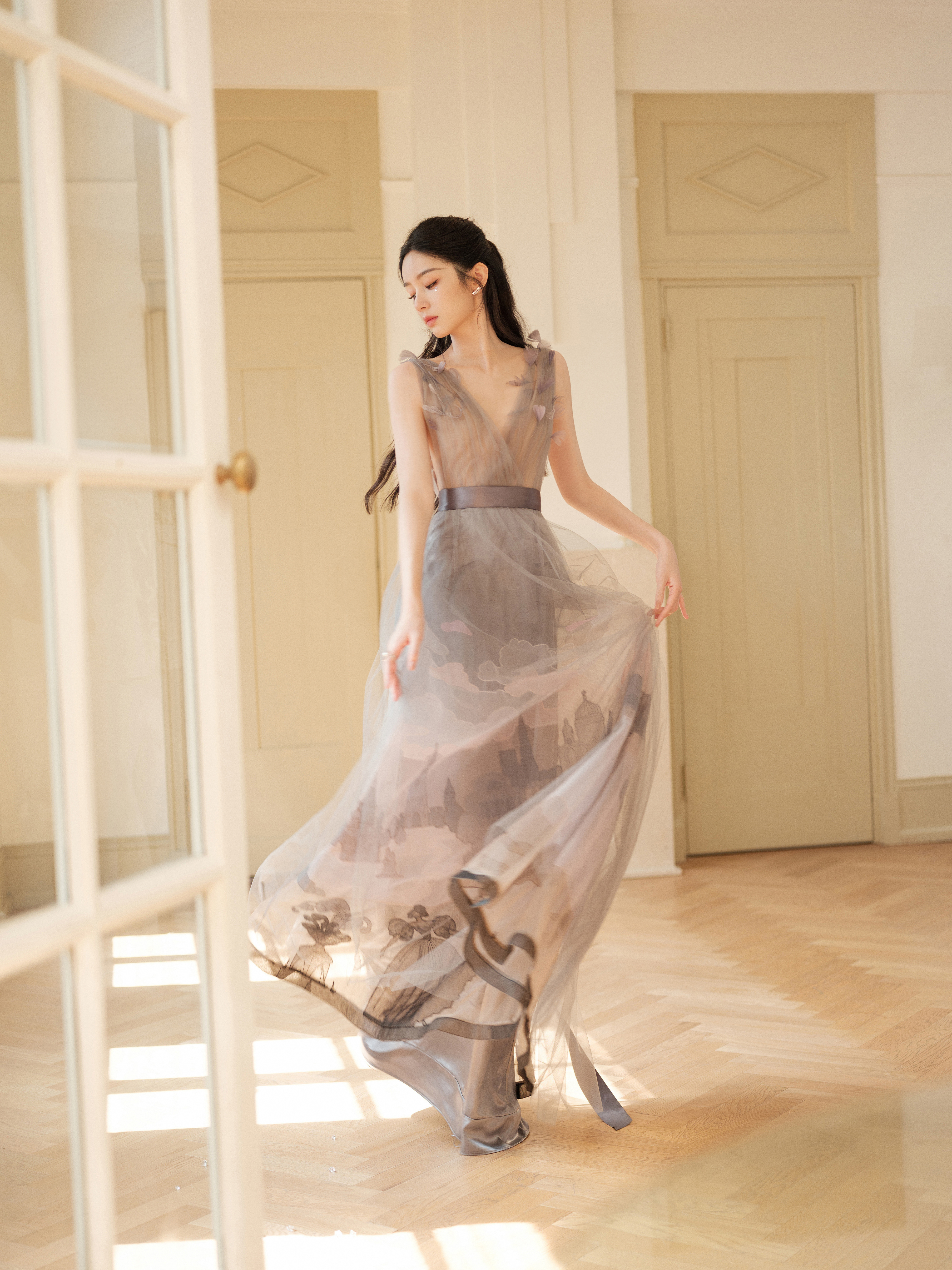 周也身着仙女纱裙,搭配慵懒卷发,光彩照人。