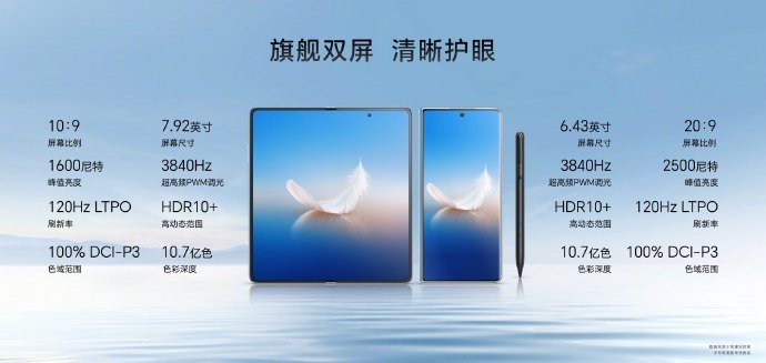 当然这块屏幕不仅支持 120Hz 的自适应刷新率调节,其他各方面的参数也看着相当不错。外屏是一块 6.43 英寸的 OLED 屏幕,20:9 屏幕比例,分辨率为 2376x1060,内屏则是一块 7.92 英寸的 OLED 屏幕,分辨率为 2344x2156,而且内外屏均支持 10.7 亿色的显示还有 100% DCI-P3 广色域覆盖。