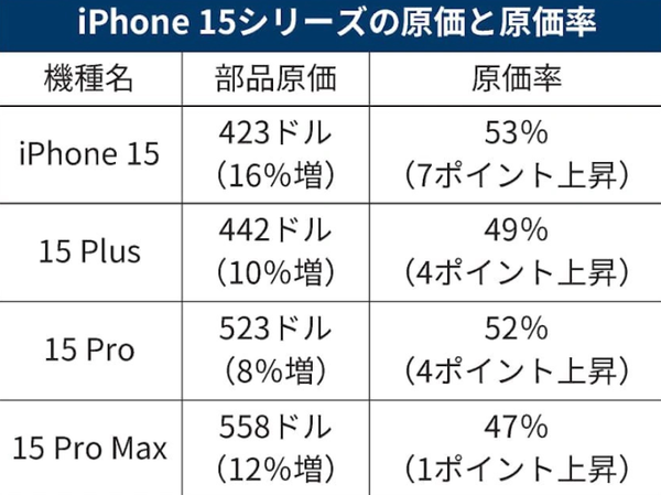 iPhone 15 Pro Max的屏幕成本比前代高出10%,钛金属边框成本则高出43%。iPhone 15 系列中的其他型号也同样昂贵,iPhone 15 Pro的成本为523美元,比去年同期上涨了8%。iPhone 15 Plus成本为442美元,比iPhone 14 Plus高出约10%;iPhone 15成本423美元, iPhone 14贵约 16%。