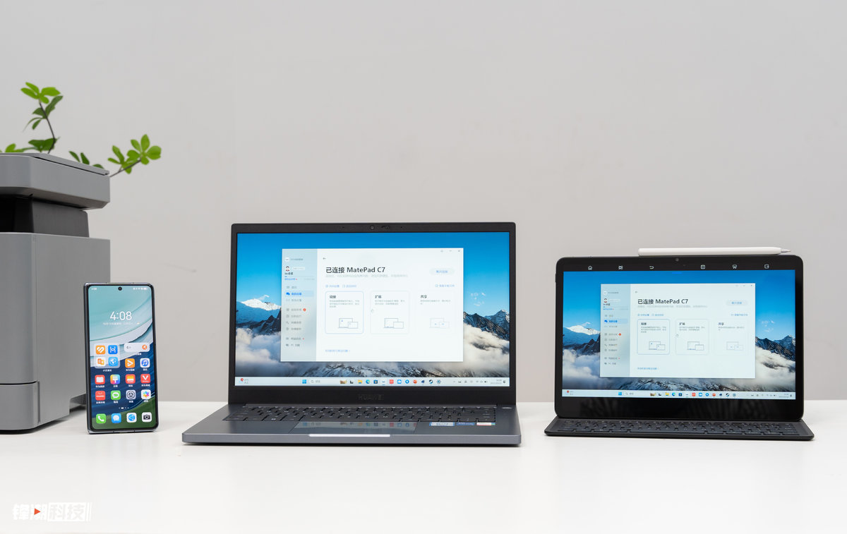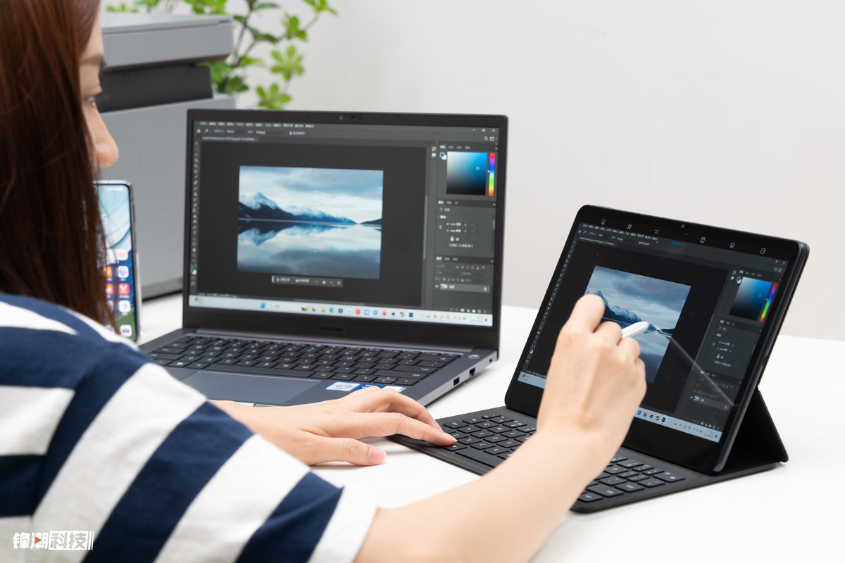 特别是搭配华为擎云 C7系列商用平板时,在通过超级终端与笔记本连接之后还可以将电脑画面投影到平板上显示,华为 M-Pencil 等平板配件也能接入笔记本的使用环境,应对一些办公修图场景也可以实现更有效率的操作体验。