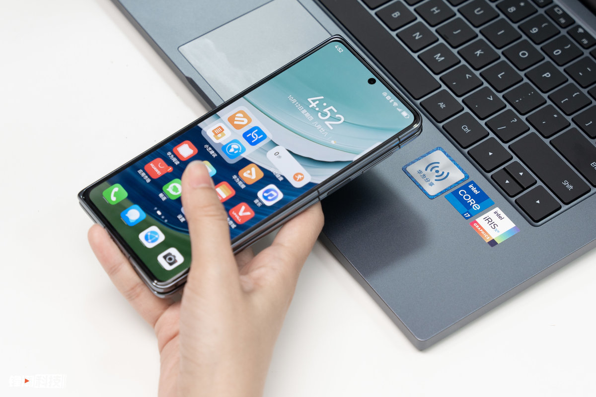 配置方面,华为擎云 G540 升级至目前最新的第13代英特尔酷睿处理器,最高搭载 i7-1360P处理器,整体性能表现强劲。值得注意的是,在华为擎云 G540标注了处理器和核芯显卡配置的贴纸旁,还放置有支持“华为Share”一碰传功能的 NFC 贴纸,使用华为手机轻轻贴上就可以传输文件,日常办公传输文件更加便捷。