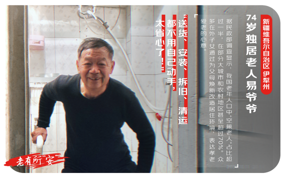“您以后上完厕所搭着扶手慢慢起来,这样可以缓解头晕,避免摔跤。”新疆伊犁州74岁易爷爷的小女儿,从视频通话里看到卫生间新装好的扶手,安心了不少。老人的三个孩子都已成家,逢年过节才能回来。