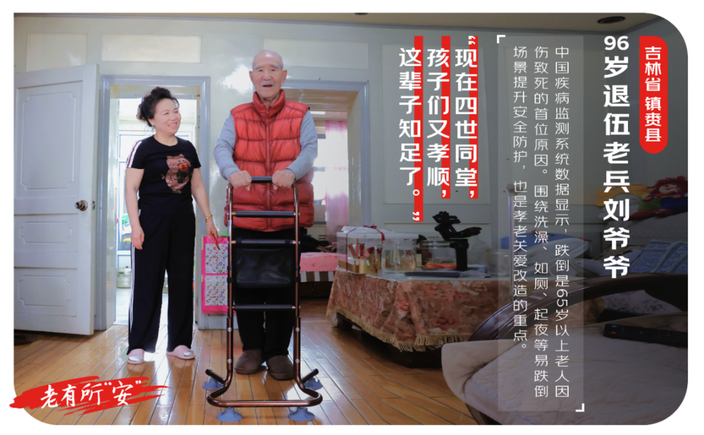 吉林省镇赉县的96岁退伍老兵刘爷爷参加过辽沈战役、平津战役、抗美援朝,早年因病卧床,家人特别担心他在家活动时会跌倒。刘爷爷的孙子关注到京东的居家适老化改造项目,给爷爷家里新添了可移动的助起器、卫浴扶手、洗澡凳以及智能马桶盖,并通过上门安装服务,解决了老人在家走路怕摔跤、洗澡怕滑倒、如厕起蹲困难的居家养老难题。