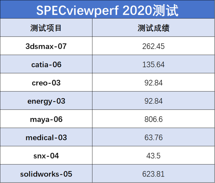 最后是SPECViewperf 2020测试,它包括了针对三维设计的3ds Max、Maya,以及针对工程模型/医疗等应用设计的Catia、Snx、SolidWorks、Creo等软件性能的测试,同样取得了非常不错的成绩。