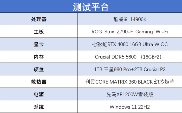 其它的就不做太多介绍了,包括Crucial DDR5 5600 (16GB*2),测试时会开启XMP;1TB三星980 Pro SSD+2TB Crucial P3 SSD;散热器为利民CORE MATRIX 360 BLACK 幻芯矩阵一体式水冷;电源为先马XP1200W雪装版。