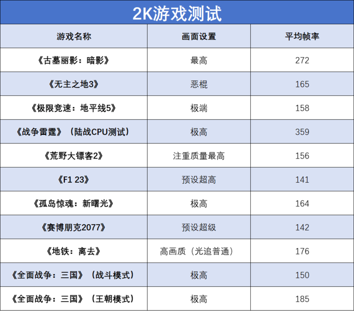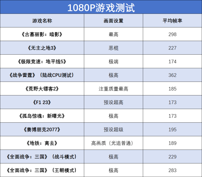 说完了理论性能上的提升,接着就通过实测来看看这颗处理器在游戏当中的表现吧。我们选择了包括《战争雷霆》、《无主之地3》、《荒野大镖客2》、《极限竞速:地平线5》以及《赛博朋克2077》在内的10多款游戏进行了测试,为了避免显卡瓶颈,我们优先选择了1080P分辨率进行了测试,当然也会给出2K分辨率的测试结果供大家参考,搭配的显卡就是七彩虹的RTX 4080 16GB Ultra W OC。1080P分辨率测试结果如下:
