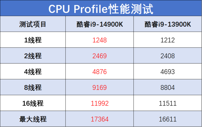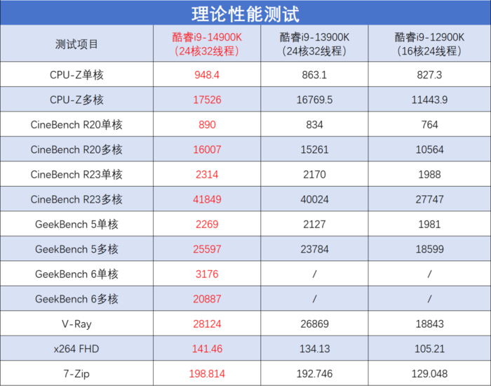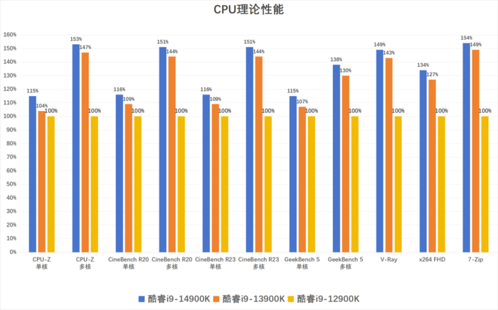 从测试成绩来看,酷睿i9-14900K单核性能对比前代领先约7-10%,多核性能提升约在5%左右,而对比酷睿i9-12900K的领先则非常大了,单核领先在10%+,多核领先幅度最高达到了50%以上。