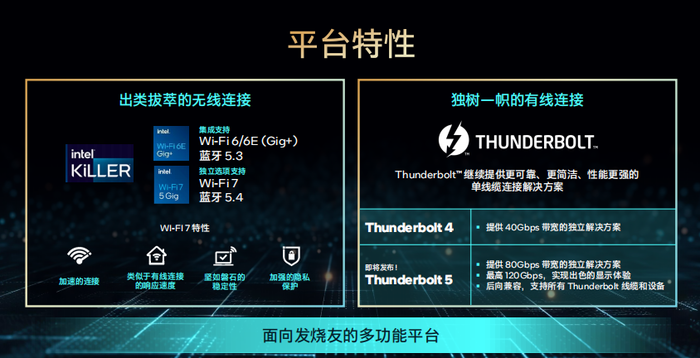 酷睿第14代台式机处理器依然支持了DDR4、DDR5,而且支持超过8000MT/s的DDR5 XMP速度。除了可以使用最新的700系列主板外,同样还兼容600系列主板。它通过集成支持Wi-Fi 6/6E和Bluetooth 5.3,并可以通过独立方式支持新的Wi-Fi 7和Bluetooth 5.4无线技术。此外,英特尔酷睿第14代台式机处理器支持 Thunderbolt 4以及即将上市的Thunderbolt 5有线连接,双向带宽最高可达80Gbps。