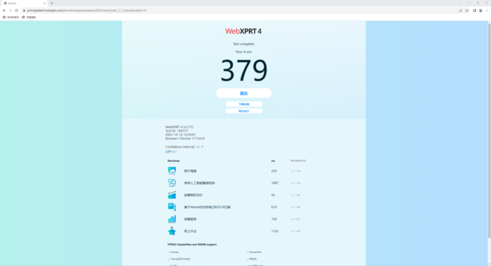我们先来看负载比较低的WebXprt 4,它包括照片增强、使用人工智能整理相册、股票期权定价、加密笔记和OCR扫描、销售图表、网上作业等典型场景,每个测试项目完成的时间越短,效率就越高,最终的分数也会越高,其总分达到了379,表现非常的出色。