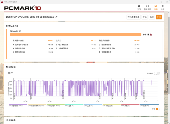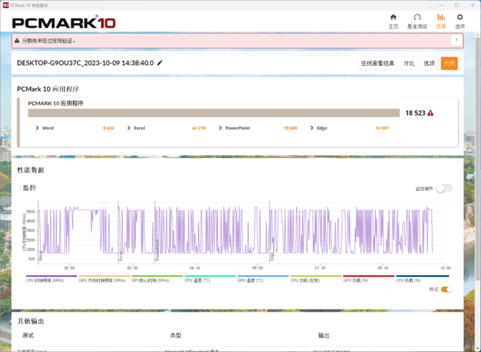 然后是PCMark 10现代办公以及PCMark应用程序测试等,前者包含常用基本功能、生产力、数位内容创作三大场景,主要针对网页浏览、视频会议、应用启动、文档及表格编写以及照片编辑和视频编辑渲染等项目,后者针对的是Word、Excel、PowerPoint等Office办公软件以及Edge浏览器的启动和使用,都是我们日常办公最常接触的。其中现代办公为9818分,应用程序为18523分。