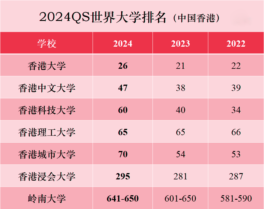 2024QS世界大学排名榜中香港有7所高校上榜,进入世界百强的高校有5所,分别为香港大学、香港中文大学、香港科技大学、香港理工大学、香港城市大学。