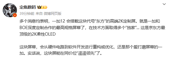 据爆料,多个消息均表明,一加12会搭载一块代号为“东方”的高端定制屏,屏幕分辨率为2K水准。虽然以前的一加旗舰也经常使用2K屏幕,但屏幕供应商往往是三星,如今则换成了京东方,这意味着一加和国产屏幕厂商的合作正在深入。