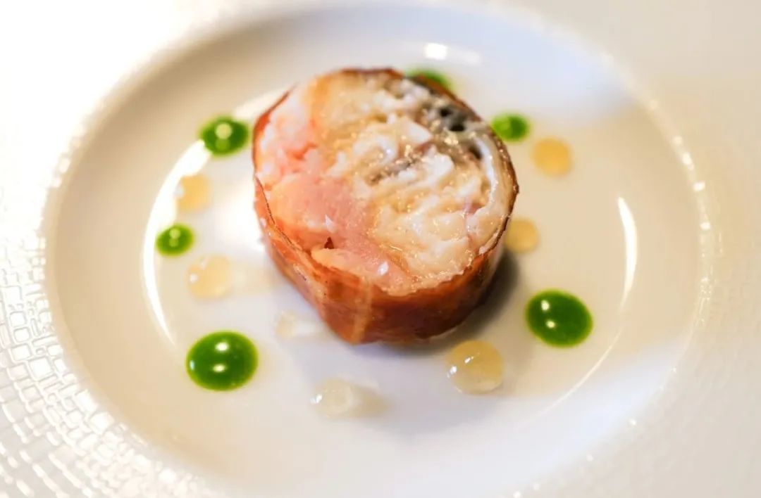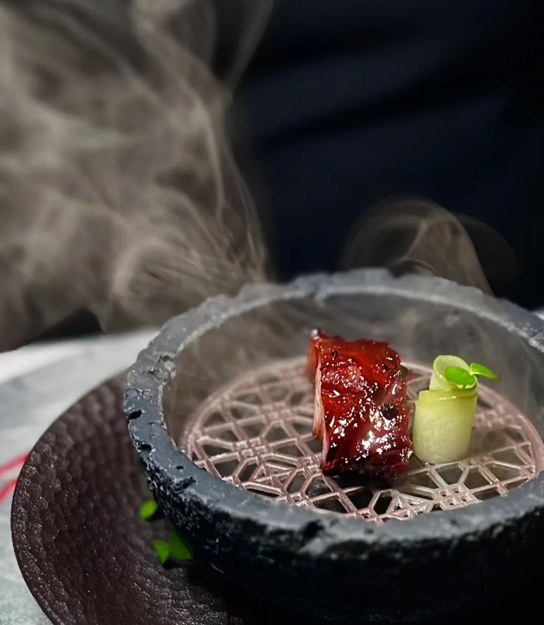 鱼和肥肠的肥美油润自不用说,馅与皮之间细腻和酥脆的鲜明对比也让人欲罢不能。鼻尖的烟熏味是Jeff的手笔,腌好的鳗鱼在冷冻成型之前,使用荔枝木屑在30℃以下冷熏45分钟。冷熏让烟气少了一丝炙烤感,也让整个体验多了一层嗅觉的美妙。