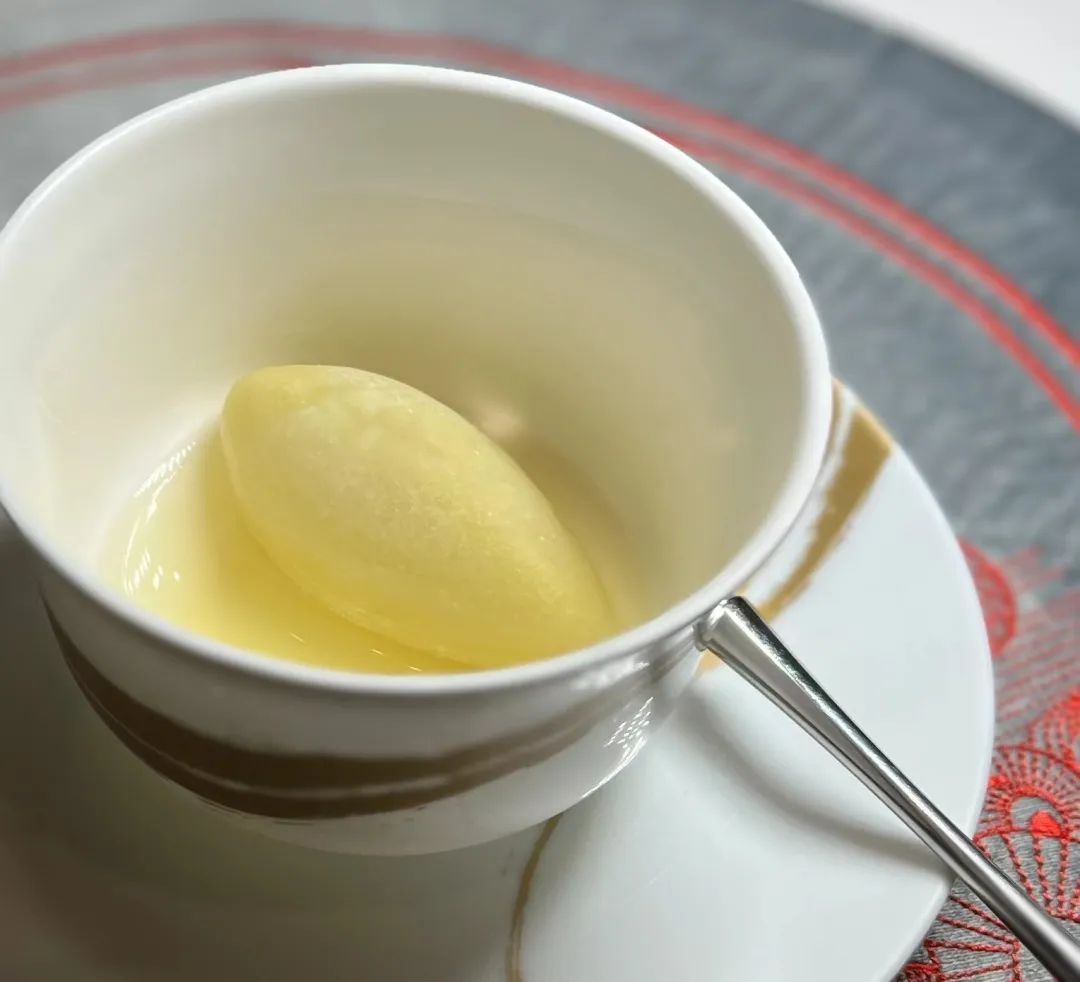 “比如我们现在有一款餐前吃的绿豆糕。我会告诉前厅,如果客人点了绿豆糕,你就准备一杯茶给他们。如果客人点了茶,我们也会送一份绿豆糕。同样的,如果客人吃了花胶和鲍鱼这样味道浓郁的食材,我们也会主动配一个雪葩给客人清口。”