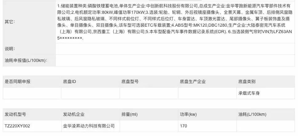 动力方面,零跑C10将会采用纯电驱动形式,搭载一台由金华凌昇动力科技有限公司所生产型号为TZ220XY002的驱动电机,并采用后置后驱布局,其最大输出功率则为170千瓦,并配备了一组磷酸铁锂电池组。