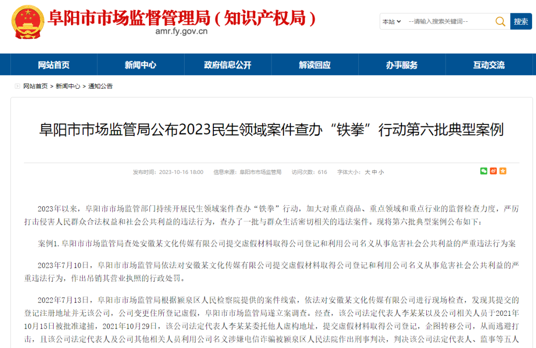 案例1.阜阳市市场监管局查处安徽某文化传媒有限公司提交虚假材料取得公司登记和利用公司名义从事危害社会公共利益的严重违法行为案
